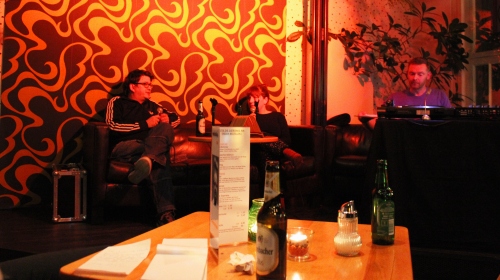 Bochum, 21.01. - Trotz klirrender Kälte und gut 10 cm Schnee stapften gegen 20 Uhr einige Besucher mit großen Taschen bewaffnet in das Endstation Kino im Bahnhof Langendreer. Doch statt wie üblich durch die schwere Tür in den Kinosaal zu treten, machten sie im Café des Kinos halt, setzten sich an die Tische, knabberten Salzstangen und Flips, bestellten sich ein Getränk und blickten erwartungsvoll zu der kleinen Empore, auf der Sofa, Plattenspieler und Anlage zum Abspielen anderer Formate bereit standen. An diesem Abend fand eine Premiere statt: Das Endstation veranstaltete zusammen mit dem Bahnhof Langendreer und dem Plattenladen für Kenner, DISCover, den ersten thematischen Vinyl-Abend. Es sollte um das leibliche Wohl in der Musik gehen, um Essen und Trinken. Ein ansprechendes Thema für den Einstand einer Veranstaltung, bei der jeder sich mit seiner Musik und seiner Geschichte einbringen kann. Für den Appetit, nicht nur auf Musik, sondern auf die materielle Nahrung, waren Tom Thelen, „Foodjournalist“ wie er sich selbst bezeichnet, und Daniel Takeshi, Betreiber des Sushi-Restaurants Takeshi, anwesend, die neben Musik über Essen, Essengehen und Essenzubereitung plauderten.