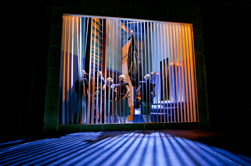 Ob das alles wider die menschliche Natur sein muss, kann niemand wissen. Die humanoiden Versuchskaninchen haben das Barock nun hinter sich gelassen – duschen, umziehen, und während „das erbärmliche Wesen Mensch“ bereits mit Computerstimme Zitatwolken aus der Kammer des Schreckens quellen lässt, beharren die großartigen Sänger Maria Helgath, Ulrich Cordes und Robin Grunwald darauf, die Krone der Schöpfung als „Mann und König der Natur“ zu preisen, der „gen Himmel aufgerichtet“ da schon immer so rumsteht. Das alles erzeugt eine kunstvolle, kaum zu beschreibende Melange aus inhaltlichen Parallelen und visuellen Wahrnehmungen, die den Blick wie ein Magnet ohne geringste Pause oder Ablenkung auf das Geschehen auf der Bühne zwingt. Eine Livekamera zeigt aus der Vogelperspektive (schon blöd, wenn bei einem Stück über digitale Zukunft Bild und Ton nicht synchron sind), wie sich der Mensch über die goldene Treppe emporschwingt ins Paradies, und das liegt dann doch irgendwo zwischen den Sternen, dort wo die Borg schon immer wohnen.