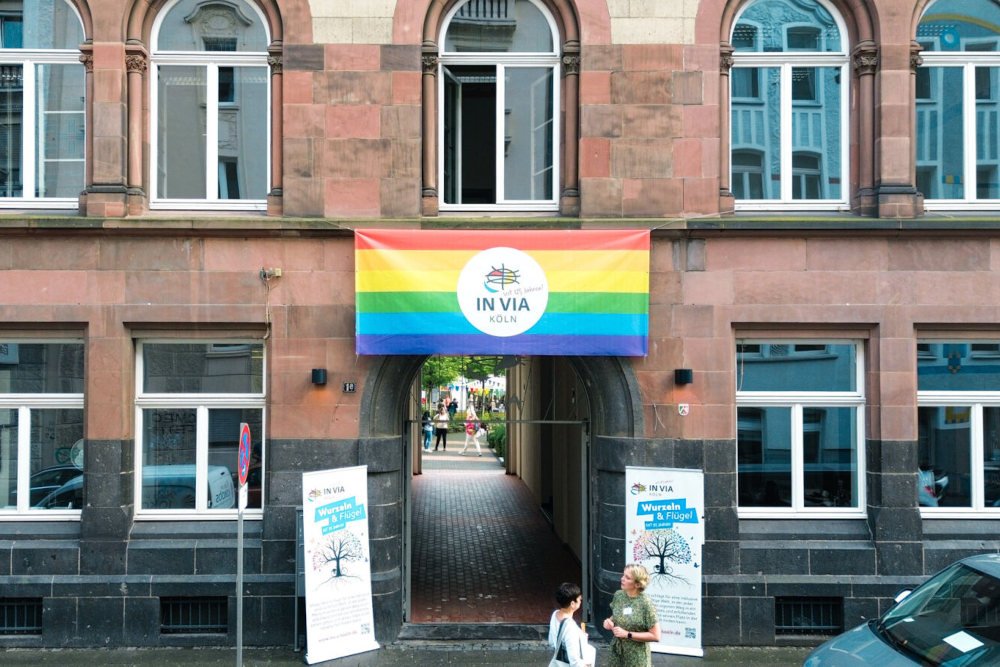 Mit 800 Mitarbeitenden, 160 ehrenamtlichen Helfer:innen und Betreuungsangeboten in insgesamt 32 Schulen ist In Via einer der größten Sozialträger in Köln – und größte im offenen Ganztag. Seine Geschichte begann vor über 125 Jahren am Kölner Hauptbahnhof, wo Mädchen und Frauen vom Land auf der Suche nach Arbeit strandeten. Einige katholische Frauen aus dem Adel und Bürgertum ergriffen daraufhin die Initiative, um einen Weg aus der Mittellosigkeit zu zeigen – daher der Name In Via: Auf dem Weg. Heute setzt sich der Verein auch als Teil des internationalen Dachverbandes für alle Menschen ein, unabhängig von Geschlecht, Identität oder Herkunft. Im ehemaligen Jesuitenkloster in der Stolzestraße und im Garten der Religionen, in dem täglich interkulturelle Führungen stattfinden, sind alle willkommen.