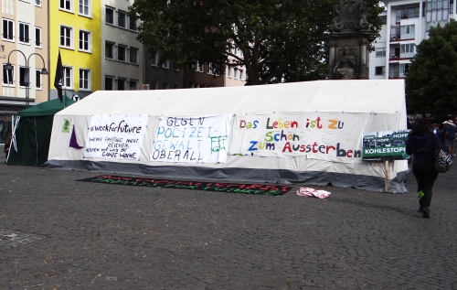 70 bis 100 Teilnehmer pro Tag erwarten die Organisatoren bei den Workshops, Mahnwachen und Vorträgen diese Woche in Köln. Eine genaue Zahl sei schwer zu schätzen, da Demonstranten immer wieder kommen und gehen könnten. Vor der großen Abschlussdemo am Freitag werden die Aktivisten auf dem Platz nicht nur arbeiten und lernen, sondern auch schlafen. Geplant sind drei Übernachtungen zwischen Dienstag und Freitag, dann soll das Camp wieder abgebaut werden. In einem großen weißen Zelt, behangen mit verschiedenen Bannern, ist Platz für bis zu 80 Übernachtende – so viele hat die Stadt genehmigt.