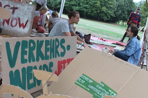 Es ist Donnerstagabend. Die jungen FestivalbesucherInnen lassen den langen Tag ausklingen. Wer nicht für das Abendessen ansteht, malt Transparente, lässt sich in einer Hängematte baumeln oder tanzt gelassen zu den K.I.Z.-Zeilen, die aus den Boxen dröhnen: „Und wir singen im Atomschutzbunker: Hurra, diese Welt geht unter!“ Damit dieser Planet eben doch keinen Klimakollaps erleidet, kriechen sie hier bereits ab sieben Uhr aus dem Zelt. Dann geht es hier mit dem Frühstück los. Für FrühaufsteherInnen steht sogar um sechs Uhr Yoga auf dem Programm. Und das Rauchen ist auf dem Kongressgelände natürlich untersagt.In Zelten mit ironischen Namen wie Peter Altmeier-Area, von der Leyen-Lobby oder Scheuers Mautstation referieren eingeladene ExpertInnen, wie der Vorsitzende des Rates der Wirtschaftsweisen, Christoph M. Schmidt. Er plädiert für eine CO2-Steuer von 35 Euro pro Tonne, später kann es mehr werden. Die SchülerInnen halten dagegen und fordern 180 Euro, sofort. Seit Beginn der Fridays for Future-Bewegung haben die AktivistInnen einen regen Austausch mit der Wissenschaft angestoßen. So sind auch beim Kongress ForscherInnen aus Berlin oder des Wuppertal Instituts zu Gast. Die für den Abend geplante Debatte zum Thema „Klimanotstand & Konsum vs. Systemkritik“ ist, anders als im Programm angekündigt, in die Nacht verschoben. Das wird auf der Leinwand an der großen Bühne projiziert. Alles ist durchorganisiert. Auch der Auftritt von Mal Elevé, der gleich im Revierpark Wischlingen singen wird. Während die meisten Kongress-TeilnehmerInnen vor der Bühne auf das Konzert des ehemaligen Sängers der aufgelösten Band Irie Révoltés warten, versammelt sich ein Grüppchen. Sie wollen den Die-in für den anstehenden Freitag proben und skandieren Slogans wie „Sie zerstören unsere Umwelt / nur für ein Batzen Geld“. Schließlich zappelt dann doch nach langem Warten Mal Elevé auf der Bühne und singt Songs über das Massengrab Mittelmeer oder alte Hits wie „Antifaschist“. Dass das Konzert schließlich mit so viel Verspätung losging, ist nicht der Organisation der jungen AktivistInnen verschuldet. Mal Elevé: „Es lag an der Bahn.“