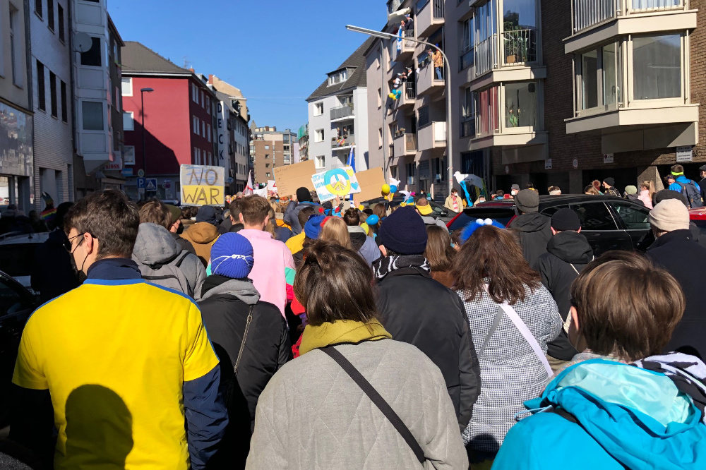 Bemalte Gesichter, Kleidung, Fahnen und hunderttausende Schilder demonstrieren auf diese Weise Solidarität mit der Ukraine. Die Botschaften auf den Schildern sind bunt gemischt. So gibt es auch einige, die auf den Rassismus bei der Aufnahme von Flüchtlingen an der Grenze aufmerksam machen wollen oder gegen Waffenlieferungen jeder Art protestieren. Aber die allermeisten fordern einfach nur ein Ende des Krieges, teilweise auch mit passenden Sprüchen zum Rosenmontag. „Jeck noh Friede“, heißt es zum Beispiel, oder: „Make FasteLOVEnd, not war!“ Dazwischen werden zahlreiche Fahnen in weiß geschwenkt – der Farbe des Friedens.