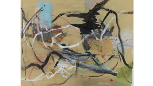 Ansehnlich sind die Arbeiten, im positiven Sinne, sehen muss man sie, nur mit dem Hineinfühlen in die Gedankenwelt der Künstlerin wird der Betrachter seine Mühe haben. Nehmen wir den „Winter“ (Öl auf Leinwand, 2015). Das Bild ist dunkel, eine fleischfarbene Fläche sticht ins Auge, eine figürliche Ahnung schwebt zwischen der landschaftlichen Drohung der kalten Jahreszeit. Nicht anders in „Mind Landscape“ von 2012 (auch Öl auf Leinwand), obwohl hier Assoziationen asiatischer Tuschezeichnungen die farbigen Klänge erzeugen. Florales und eine winzige Hütte mit blauem Dach? Vielleicht, vielleicht aber auch nicht. Vielleicht ist es auch nur die Rhythmik eines ziellosen Pinselstrichs der uns diese Wahrnehmung vorgaukelt. Seit drei Jahren verfolgt die Künstlerin diesen Weg, fast geräuschlos malerische Klangformen zu setzen, die sich nur sehr langsam auf der Fläche verdichten, wie flüchtige Gedanken, mal hier, mal da, und schon wieder weg, bis sich dann doch ein schemenhaftes Abbild herauskristallisiert, dessen Funktion nicht mehr verstanden werden muss. Wie der Titel schon preisgibt. Es gibt viel zwischen Bergen und Wasser.