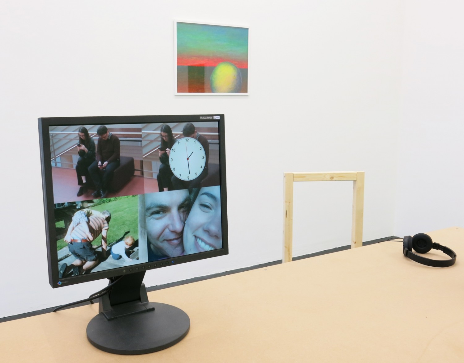 Schon bei Eintritt in Milius‘ Welt durch ein eigens eingebautes weißes Tor fällt der Blick auf eine tickende Wanduhr – mit wolkig übermalten Zeigern. Korrespondierend fuchtelt im Monitor auf dem ersten Schreibtisch ein Trickfilmmännchen uhrzeigergleich mit den Armen: Der Künstler hat ein Game programmiert, in dem der User seine Figur vor fallenden Uhren bewahren muss. An einer weiteren Station läuft die Zeit rückwärts wie im Kopfhörer die 1980er-Jahre-Songs aus Milius‘ Kindheit. Auch an anderen Arbeitsplätzen wird nicht gerade wertschöpfend malocht, sondern Familienfotos gesichtet und unspektakuläre Urlaubs- und Straßenvideos angeklickt. Schlichte surreale Gemälde und Alltagsfotos von Parkbänken und Schaufenstern dienen als Wandschmuck. Etwas abseits wird das gebastelte Modell eines leeren mehrstöckigen Hauses präsentiert, Miniatur-Hausmeisterfiguren inklusive.