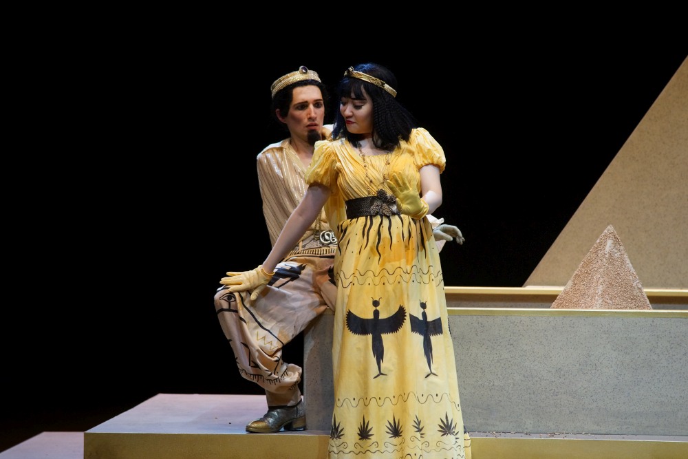 Dongmin Lee singt die Pharaonin mit ebenso viel Witz und Charme wie der junge Countertenor Etienne Walch ihren Bruder. Esist eine ganze Reihe junger Ensemblemitglieder, die in dieser Produktion glänzt: Allen voran die Mezzosopranistin Rina Hirayama in der Titelrolle, welche ursprünglich (wie auch der Tolomeo) für einen Kastraten mit virtuosen Koloraturen angelegt war. Hirayama hat die nötige Beweglichkeit und Präzision, entwickelt nach den ersten Szenen auch das nötige Stimmvolumen für einen Feldherrn. Indes weiß die Regie den Widerspruch zwischen der zierlichen Darstellerin und dem dargestellten Schlachtenlenker humoristisch schön auszuschlachten: Wenn Cäsar sein großes schweres Schwert in Heldenpose gen Himmel reckt, braucht er den stützenden Arm seines Tribuns Curio (Timothy Edlin).