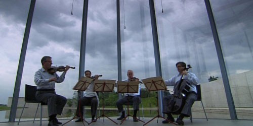 „Die Kunst der Fuge“ als Filmkonzert ohne Publikum, mathematisch geprägte Musik in einer sachlich- statisch geprägten Architektur von ebenfalls erhabener Größe: Der Stararchitekt Tadao Ando hatte auf einer ehemaligen Nato-Basis zwischen Neuss und Düsseldorf das Kunst- und Ausstellungshaus der Langen Foundation gebaut, ein filigranes Werk aus Stahl, Glas und Beton mit herrlichen Ausblicken und Durchsichten, das 2004 eröffnet wurde.