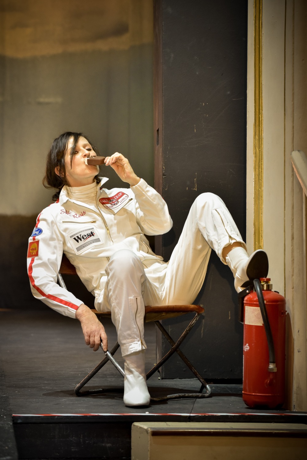 Wenn die kleine Maria Cecconi gesucht wird, wird auch schon mal eine Luft-Boden-Rakete abgefeuert und ein wirklich riesigerHigh-Heel-Pumps drängelt sich ferngesteuert durch die Vorhänge, wird zum Kind, zum Rennwagen, zum skurrilen Momentum. „She put de lime in de coconut, she drank 'em bot' up“: Harry Nilssons „Coconut-Song“ – die gefühlte Dauerschleife von 1971 – weht dazu durch den Raum. Was geht noch auf der leeren Fläche mit gemaltem Himmel? Filmschauspielerin Sophie Rois ist Rennfahrerin für Lotus und kommt nach Drehschluss nicht mehr aus ihrer Rolle heraus. Alle andern auf der Bühne