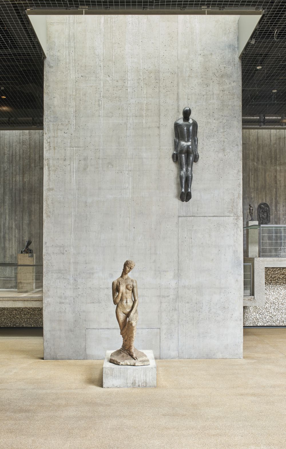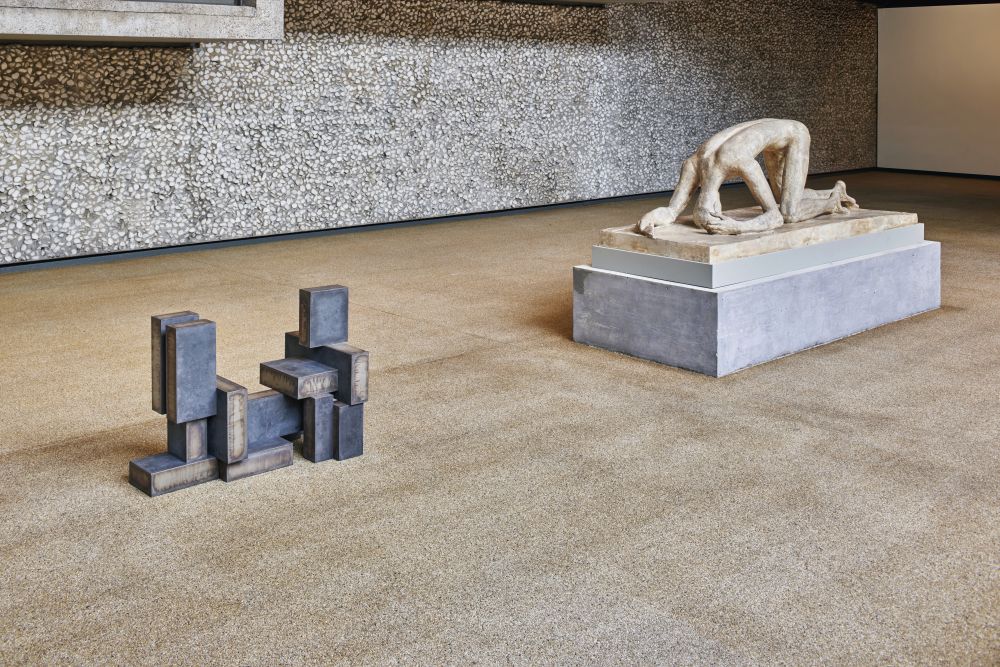 Wilhelm Lehmbruck, Kniende, 1911 | Antony Gormley, SHIFT, 1991, Ausstellung Lehmbruck Museum, Duisburg 2022, © Antony Gormley, Foto: Dejan SaricSöke Dinkla hat im Pressegespräch betont, wie sehr Gormley mit seinen Werken auf die Anlage des Museums, das Elemente der Moderne und Aspekte der Postmoderne verbindet, eingeht, diese kommentiert und analysiert. Das setzt sich noch in seinem pointierten, respektvollem Dialog mit Wilhelm Lehmbruck (1881-1919) fort, der mit seinen innigen Gesten und Längungen die Skulptur im frühen 20. Jahrhundert erneuert hat. Im Lehmbruck-Trakt reagiert Gormley auf seine Skulpturen, arbeitet deren Intentionen und Intensität heraus und zeigt mit verblüffenden Korrespondenzen, was auch in seinen Werken an Verinnerlichung und Gefühl für die Struktur des Körpers, aber auch an bildhauerischem Instinkt steckt – und dann erkennt man erst recht, was für ein großartiger Künstler Gormley ist.