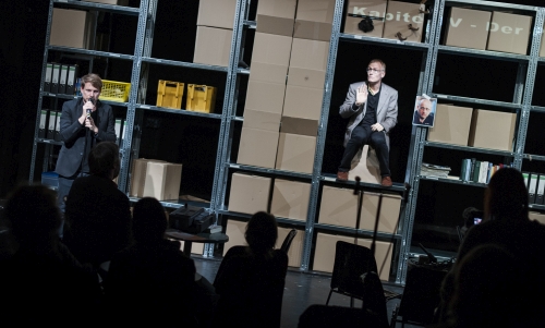 Doch zurück an den Anfang. Theater Oberhausen, Saal 2, Tische, Stühle, drei Sitzreihen, ein Stahlregal voll mit Büchern und Recherchematerial in Kisten, niemand ist zu sehen. Also ein Bier bestellen und abwarten. Jan Christoph Gockel hat dieses Stück vor sechs Jahren in Osnabrück inszeniert, jetzt hat es Oberhausen als Übernahme erreicht. Mit Knalleffekt platzen die beiden Schauspieler Dietmar Nieder und Clemens Dönicke aus dem Regal, sie sind Autor und Nachbar, Täter und Journalist, sie ringen nach Wahrheit und Sinn. Die Tragödie hat etwas Dokumentarisches, denn sie hat sich 1993 in einem kleinen französischen Ort an der Schweizer Grenze zugetragen. Der Täter ist ein armes Würstchen, eine verpasste Medizin-Klausur wird zur ersten Lüge, die weitere nach sich zieht, Romand wird zum Betrüger, zum Hochstapler, sein ganzes Leben ist eine Farce, bis die Blase platzt.