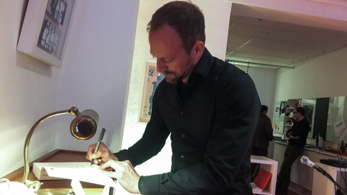 Gunther Geltinger wollte ursprünglich Regisseur werden, studierte Drehbuch und Dramaturgie in Wien und Köln. Doch der Blick hinter die Kullissen und Abläufe eines Filmsets sorgten für die Entzauberung dieses Mediums und er wandte sich der Literatur zu. Sein erster Roman „Mensch Engel“ erschien 2008 bei Schöffling, mittlerweile ist er Suhrkamp-Autor (wo auch die Taschenbuchausgabe des Debüts zu finden ist). Bevor er an diesem Abend seinen aktuellen Roman „Benzin“ vorstellt, wird der Faden des visuellen Erzählens aufgegriffen: Ein kurzer Ausschnitt aus Pasolinis „Teorema – Geometrie der Liebe“ mündet in ein Gespräch über die Rolle des Künstlers. Erst danach führt Geltinger ein in seinen Roman. Im Gegensatz zum Gespräch mit Kuckart offenbart der Vortrag Geltingers sein Stottern, das er schon in seinem zweiten Roman „Moor“ motivisch verarbeitet hat. Sein zeitweiliges Stocken an unerwarteten Stellen führt zu einem ganz eigenen Sprachrhythmus, der auf der einen Seite ein komplettes Eintauchen des Zuhörenden in die Geschichte blockiert, auf der anderen Seite aber einzelnen Wörtern, der Sprache selbst, mehr Tiefe verleiht.
