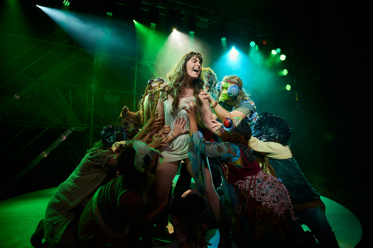 Dann gab er die Bühne frei für sein elfköpfiges Ensemble, das auf einer leicht schrägen, mit dem Friedenssymbol der Hippie-Bewegung der Endsechziger Jahre verzierten Drehbühne (Setdesign: Frank Rommerskirchen) jene Zeit wieder auferstehen ließ, in der man sich von der Eltern-Generation lossagte, gegen Atomkraft und den Vietnamkrieg protestierte, der freien Liebe frönte („Wer zweimal mit derselben pennt, gehört schon zum Establishment“) und Drogen-Konsum als Bewusstseins-Erweiterung propagierte.