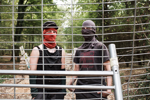 Die drei Aktivist:innen tragen zerschlissene Kleidung, Piercings, betont kurze Haare oder manche verfilzte Strähne, klettern in Lederstiefeln oder barfuß über Erde und Geröll. Sie sind irgendwo in den Zwanzigern bis Dreißigern, schweigen über ihre Lebensläufe und wahren Namen. Auf dem Erdwall, in Sichtweite des Sicherheitsdienstes des Tagebaubetreibers RWE, haben sie ihre Gesichter verhüllt. Gegenüber hat ein „Seku“, wie sie die Sicherheitsleute nennen, im PKW Posten bezogen; durch die Windschutzscheibe zeichnet sich eine Silhouette ab.