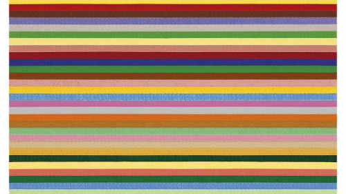 Rolf-Gunter Dienst konzentriert sich in seiner Malerei auf die Konstituenten des Mediums: auf die Fläche, die Linie und eben die Farbe. Maß aller Dinge ist bei ihm der Horizont als waagerechter, monochromer Streifen, der trennt, die Fläche strukturiert und die Wahrnehmung der benachbarten Streifen beeinflusst. Seit langem schon folgen in der Malerei von Dienst Streifen aufeinander, welche sich von Bildrand zu Bildrand erstrecken und um die Kanten ziehen. Teils hat Dienst Systematiken entwickelt, nach denen eine Abfolge sich wiederholt. Teils auch handelt es sich um einige wenige breite Bänder. Mitunter (wie in der „Piccolo“-Serie im Dachgeschoss der Alten Villa) treffen die Streifen inmitten des Formates auf eine monochrom anmutende Fläche. Die Horizontale verweist aber auch auf unser Lesen von links nach rechts im zeitlichen Ablauf. Aus der Nähe erkennt man dann skriptural wirkende Schleifen, die linear dicht nebeneinanderstehen und die homogen wirkenden Streifen in Schwingungen versetzen und eine farbliche Nuancierung und räumliche Schichtung bewirken.