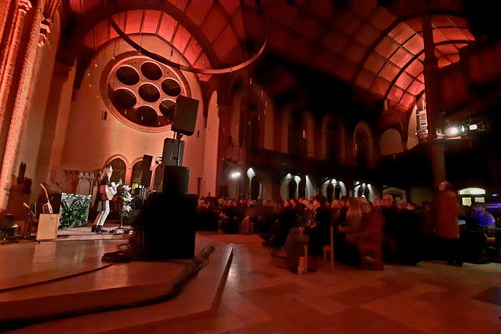 Das ändert sich schlagartig, als Heather Nova die Bühne betritt. Die zierliche Person nimmt mit „Beautiful Storm“ sozusagen im Sturm das gesamte Kirchenschiff ein. Der Sound in der Kirche ist glasklar, auch seitlich der Bühne von großer Brillanz. Heathers Stimme ist immer noch so überzeugend wie vor 30 Jahren in ihrem Spektrum von scheinbarer Verletzlichkeit über sirenenhafte Passagen bis zum emotionalen Ausbruch. Die Ausbrüche zügelt sie allerdings an diesem Abend. Das Akustikprogramm nimmt auch aus einer Rock-Nummer wie „Make You Mine“ (zusammen mit Jonathan Frith an Vocals und Mundharmonika) den Druck, ohne dass der Song an Intensität verlöre. Zwischen den Songs erzählt die Sängerin, die auf den Bermudas aufgewachsen ist, wie sie beim morgendlichen Spaziergang die herbstlichen Birken im Altenessener Park an Besucher bei ihrer Oma in Kanada erinnerten und leitet über zum Song „Rewild“. Die Besinnung auf die Natur ist eines ihrer zentralen Themen und Anliegen, ebenso das Schicksal ihrer heimatlichen Inselwelt im Angesicht des Klimawandels: Mit „I’m swimming over rooftops“ beginnt Ihr Song „Safe a Little Piece of Tomorrow“. Das Bild entstand aus dem Gedanken, dass ihr Sohn eines Tages das Haus seiner Kindheit weit unter dem Meeresspiegel vorfinden wird, wenn sich die Klimapolitik nicht ändert.