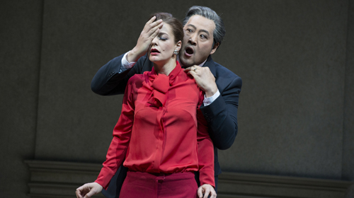 Regisseurin Lanik zeigt sie in einer sich selbst erklärenden Achterbahn der Gefühle: Als Edelhure hat Violetta von ihrem Umfeld, einer dekadenten Partymeute, kein Mitgefühl zu erwarten. Als sie im rauschenden Fest zum ersten Mal schwächelt, werden noch ein paar Handyfotos geschossen, bevor der feierwütige Tross einfach weiterzieht. Hinter der Fassade wird von Violettas Leben nichts mehr übrig bleiben. Doch dann tritt der junge Schwärmer Alfredo in ihr Leben. Alfredo ist in Dortmund ein biederer Fremdkörper in einer bizarren, sexbesessenen Gesellschaft. Er wird Violettas Anker in der Not. Viel mehr billigt ihm die Regie nicht zu. Lucian Krasznec singt eine starke Partie, bekommt als Charakter allerdings nicht viel Gewicht. Weitaus wirkungsvoller setzt Lanik den durchweg überzeugenden Bass Sangmin Lee als machtbewussten und übergriffigen Vater Germont in Szene. Von solchen Männern hat Violetta allesamt nichts zu erwarten. Selbst die große Liebe bleibt eine Illusion.