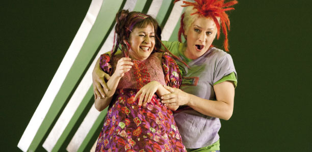 Hunger kann in den Wahnsinn treiben – oder doch zumindest heftig die Wahrnehmung verzerren. Auf dieser These baut der holländische Regisseur und Bühnenbildner Michiel Dijkema seine Inszenierung der Humperdinckschen Märchenoper „Hänsel und Gretel“ auf, die das Gelsenkirchener Musiktheater im Revier zeigt. Wenn sich dort die Kinder im Wald verirren, zeigt Dijkema keine Bäume, sondern surreal überdimensionale Gabeln und Steakmesser mit bedrohlich scharfen Spitzen und Kanten. Die Landschaft aus Besteck ist eine Vergrößerung des heimischen Esstischs. Hänsel hatte die Klingen und Forken resigniert ins Holz gerammt, weil die Küche mal wieder kalt geblieben war. Die Stiefmutter (Noriko Ogawa-Yatake im Wechsel mit Majken Bjerno) ist eine zänkische Schlampe, die in Camouflage-Hose, Kittelschürze und mit Lockenwicklern auf dem Kopf (Kostüme: Claudia Damm) durch die Küche fegt und ihren Frust an den Kindern auslässt. Und auch vom Vater (Bjørn Waag) ist nicht viel zu erwarten. Die leere Pulle in der Hand steht da ein sichtlicher Schluffi in der Tür, kratzt sich im Schritt und interessiert sich herzlich wenig für die Familie. Willkommen bei den Flodders! Hänsel und Gretel wachsen am untersten Rand der Unterschicht auf. Die Regie hat sie aus dem fernen Märchen- ins reale, heutige Hartz IV-Land an der Emscher verpflanzt.