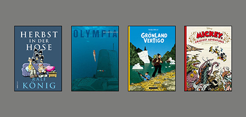 Der französische Verlag Glénat hat eine Hommage-Reihe mit Mickey-Maus-Bänden von bekannten Zeichnern initiiert, deren erste Bände mit Interpretationen von Trondheim & Keramidas bzw. Cosey inzwischen auch auf Deutsch erschienen sind. Cosey nutzt mit „Eine geheimnisvolle Melodie“ die seltene Gelegenheit, um sentimental leichtfüßig einen Mickey in den späten 20er Jahren auf eine unabhängige, feministische Minnie treffen zu lassen. Eine charmante Liebesgeschichte! Lewis Trondheim und Keramidas tun so, als hätten sie mit „Mickey‘s Craziest Adventures“ lange verschollene Mickey-Abenteuer aus den 60er Jahren als Faksimile veröffentlicht. Den Dreh mit den vermeintlichen Fundstücken hat Trondheim bereits bei „A.L.I.E.E.N“ angewandt. Hier werden daraus surreale Stories, wie sie Mickey und Donald wohl noch nie erlebt haben, inklusive verfärbter und angerissener Seiten. Ein großer Spass! Es folgen demnächst noch mindestens zwei weitere Bände (beide Egmont).