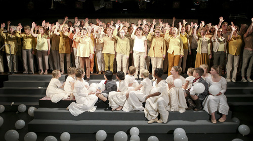 Er wurde zum einem zeitlosen Rätsel, das ihn zwar das Leben kostete, ihn aber auch zum zeitlosen Star machte. Und in der Inszenierung von Alexander Kerlin und Thorsten Bihegue, die den Monster-Chor auch als 17. Ensemblemitglied 2011 ins Leben riefen, hat er durchgehend diesen Zettel in der Hand, auf dem stand, er möchte ein Reiter werden, wie sein Vater es gewesen. Diesen Part übernehmen die 14 Kinder grandios, obwohl es bei den beiden regieführenden Dramaturgen eher recht ordentlich um Sprache, Blumen und die Neue Deutsche Welle geht. Dass Hauser damals auch genauso gut Fred vom Jupiter hätte heißen können, ist eine lustige Idee – und ein gewisser Andreas Dorau liefert dem Chor zahlreiche musikalische Anekdoten, wie auch Nena oder der gemeine Volksmund. Ach ja, und natürlich Peter Handke, dessen Sprachclownerien in „Des Kaspars neue Kleider“ wohl auch seinen Anteil an der Gesamtperformance hatten. Nun, die Sprachlosen aus Devil County hatten ihre gute Stunde Spaß, Tommy Finke, der neue musikalische Direktor des Schauspiels sicher auch, und so versank der historische Kaspar Hauser am Schluss in den 99 Luftballons von Nena.