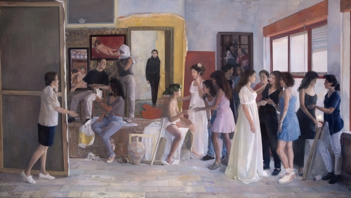Noch einmal begegnet uns Ibáñez in der Ausstellung auf dem leider etwas abseits hängenden Großformat „Der Garten der Bacchanten“. Es zeigt das Atelier des Künstlers. Mehrere Szenen scheinen ineinander verschachtelt zu sein. Sie stellen den Maler als Großkünstler vor, umgeben von den eigenen Gemälden. Sind die vielen hübschen Frauen die Modelle oder die Besucher einer Vernissage oder sonst eines Festes? Der Maler sitzt auf der Bühne, welche ihn noch heraushebt, und ist mitten im Malen begriffen, beugt sich aber im Gespräch zu einer dahinter stehenden Frau. Von vorne kommt eine hinzu, die mehr an eine Sekretärin erinnert (tatsächlich ist es aber die Mutter des jungen Mannes). Malerei wird zum öffentlichen Vorgang und findet alles andere als im stillen Kämmerchen statt. Erstaunlich ist, wann dieses Bild, sozusagen im jugendlichen Überschwang nach den ersten Erfolgen entstanden ist: 1995, also im Alter von gerade 24 Jahren. Wenn es für etwas prophetisch ist, dann für das Selbstverständnis, eine öffentliche Person zu sein, die sich folglich einmischt und Stellung bezieht. Mit einer solchen Genremalerei stellt sich Ibáñez ausgesprochen selbstbewusst in die Tradition der Kunstgeschichte seines Landes mit Zurbáran und Velázquez. Deutlich wird dies auch bei den Malereien, die sich den Machenschaften und Verstrickungen der Kirche zuwenden und das spanische Königshaus kommentieren.
