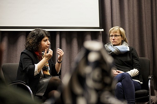 Eine Frau im Publikum merkt an, dass dieser Zusammenhalt schlicht notwendig sei zur Selbsterhaltung der Gemeinschaft. Aymaz stimmt zu, nennt es aber auch bemerkenswert, dass sowohl die jesidische Gemeinschaft als auch die kurdische Regionalregierung sich konstruktiv im Umgang mit den Geschehnissen zeigen. Trotzdem bleibe entscheidend, welchen Status die Jesidinnen haben, wenn der Krieg einmal vorüber sein wird. Für ein normales Leben sei eine Heroisierung oder Romantisierung ihres Schicksals nicht hilfreich.