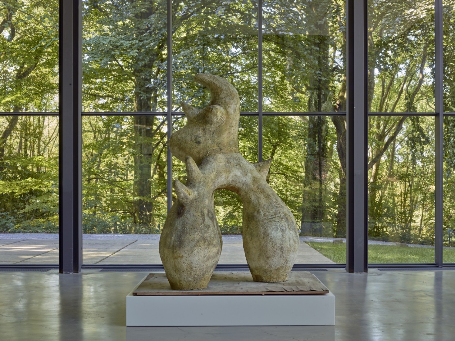 Joan Miró war schon zu Lebzeiten Kunstmarkt-Mainstream, sein Symbole-Kanon breitenwirksam, alles konnte von jedermann assoziativ, fantasievoll wahrgenommen und gedeutet werden. Zu sehen sind jetzt Objekte des Spätwerkes, entstanden zwischen den Jahren 1970 und 1982. Gleich hinter dem Eingang des Ausstellungspavillons steht auf einem Sockel „Personnage Oiseaux“ (1977) ein kleines Auflagenobjekt aus Bronze, das zweifellos eine Vogelfigur darstellt, erkennbar am Kopf mit Schnabel aus dünnen Draht und dem verwirrenden, zweibeinigen Körper mit Auge, Mund und Ohr. Alles mit grüner Patina überzogen. Mächtiger ist da schon nebenan „Tête“ von 1974. Der Bronzekopf, auch eine Leihgabe des britischen Yorkshire Sculpture Park, durchbricht seine metallische schwere mit stilisierten Augen, Mund und Nase, die auch etwas Vogelhaftes haben, von sehr grotesken Ohren oder Extremitäten ganz abgesehen. Diese überbordende Formensprache, die doch immer wieder mit denselben Bausteinen arbeitet, erreicht die Menschen über alle Grenzen hinweg, auch an diesem Samstag sind im Park und im mittleren Pavillon viele Sprachen zu vernehmen.