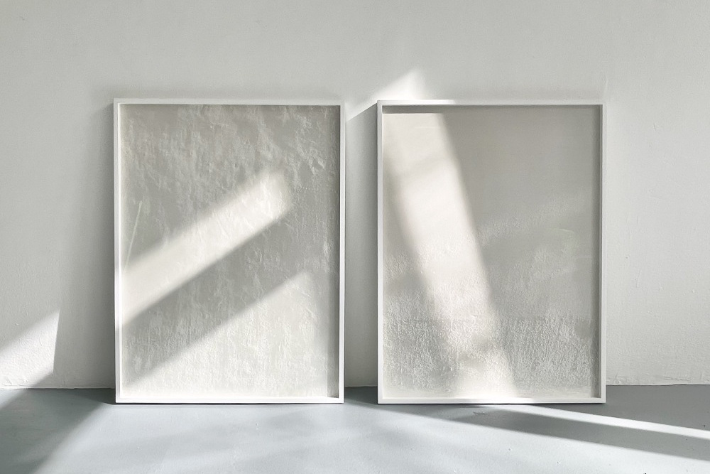 Was man selbst an trüben Tagen zunächst vielleicht als Sonnenfleck an der Wand liest, entpuppt sich als andernorts aufgenommene Videoprojektion, Schatten von zufälligen Passanten. Die beiden Leuchtröhren, die mit dem Deckenlicht korrespondieren, sind nicht verantwortlich für eine amorph geschlängelte Spiegelung an der Wandfläche daneben. Im Raum ist die Lichtquelle zu entlarven. Auch die sechs Bildobjekte benötigen den Nahblick. Sie zeigen Wandausschnitte, Fotovergrößerungen von feinsten Strukturen der geweißten Wände mit übertünchten Dübellöchern, Kerben und Unebenheiten. Schemenhafte Schattenzonen an den Randbereichen irritieren allerdings. Die Künstlerin hat sie durch variierte Kontraste und Tiefenschärfe erzeugt oder mit Pigmenten zart aufgerieben.
