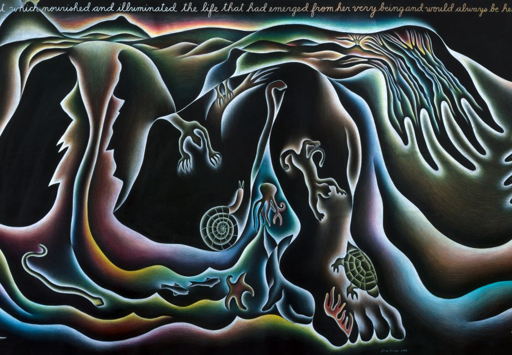Angefangen hat sie, das überrascht im ersten Ausstellungsraum, in den 1960ern mit minimalistischen Papierarbeiten von pastellfarbenen Streifen und Kreisen, rhythmisierte geometrische Formen, zurückhaltend und unpersönlich. Bis es dann Anfang der 70er aus ihr herausbrach, wild, wütend und betont provokant: Die Lithografie einer entflammten Vulva als Offenbarung (Revelation) und Start in eine lebenslange Mission zur weiblichen Selbstermächtigung steht neben der Videopräsentation und Zeichnungen rund um ihre bekannteste Aktion „The Dinner Party“ (1974–79) zur Würdigung von 1038 Göttinnen, Wissenschaftlerinnen und Autorinnen, die Weltgeschichte schrieben, ohne die gebührende Anerkennung erfahren zu haben. Ein meterlanges Tableau zur Erschaffung der Welt durch eine Muttergottheit erstreckt sich durch die Erdgeschosshalle.