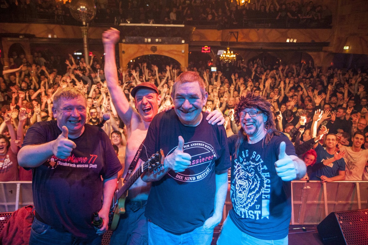 Nun ja. Was heute noch nach Märchen klingt, kann morgen schon Wirklichkeit sein. Kein schwarzweiß Science-Fiction, sondern eine bunte Punk-Operette von Andreas Beck und Thorsten Bihegue im Theater Dortmund setzt dieses uralte TV-Zitat im Kopf frei. Ursache ist die krude Geschichte, die in „Die Kassierer und Die Drei von der Punkstelle“ erzählt wird: Da steckt das Ruhrgebiet in einer dunklen Zukunft. Nicht das Wölfe durchs menschenleere Gelsenkirchen streifen oder Westwestfalen nach der so genannten Pumpenkatastrophe abgesoffen ist, nein, viel schlimmer: Alle Brauereien im Revier liegen in der Hand eines bösen Investors namens „Der Konsul“, selbst das herrlich herbe Pils (ich bin Bochumer) schmeckt nur noch nach Plörre, was man ja heute schon an einer ähnlichen Marken-Konzentration nahe der Dresdner Heide feststellen könnte. Doch im Musiktheater mit den alten Punkern aus Wanne geht’s eben nur um die zukünftig entvölkerte Metropol-Region und erst als Punk-Legende Wölfi nach mehr als einem Jahr spurloser Verschwundenheit zurückkehrt, scheint Rettung in Sicht, doch die tolle Idee nun selbst Bier zu brauen hat einen fatalen Haken: Wölfi verwandelt jedes Bier, das er anfasst in Wein und dann taucht die schöne Laika auf, ich hoffe nicht aus dem Weltall. So weit so krude, immer gewiss: „Das Schlimmste ist, wenn das Bier alle ist“ (Die Kassierer).