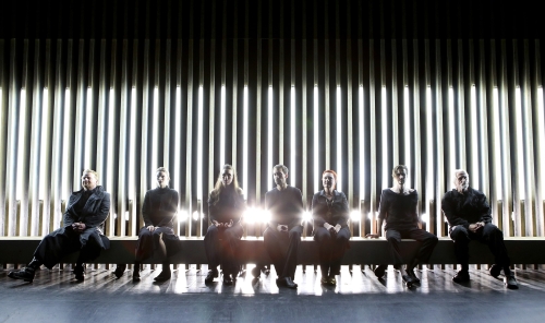 Am Anfang sitzen erst einmal alle apollonischen Sieben auf der kargen Bank vor der stäbigen Wand und schauen wortlos ins Nichts. Zuerst durchbricht der Wächter (Heiner Stadelmann) die Stille, steht auf, auf das Dach des Palastes, wo er auf das ersehnte feurige Siegessignal aus Troja wartet. Der Chor der Greise bleibt erst einmal brav auf dem Balken. Nach und nach, Person für Person kann dort die eigentliche Geschichte hinter der Tragödie rezipiert werden, dann tritt der siegreiche Agamemnon auf. Werner Wölbern ist ein nachdenklicher, gefasster Heerführer und König von Mykene. Vorsichtig, verschlagen kommt er daher, mit der jungen Konkubine Kassandra (Therese Dörr) im Schlepp als Kriegsbeute. Ehegattin Klytaimestra (Anke Zillich), selbst mit jungem Lover Aigisthos (Marco Massafra) unterwegs, ist „hochrot“ erfreut und versucht erst ihn zu blamieren, dann zu täuschen – nun bald wird sie ihn erschlagen, für ein bisschen Wind hat Agamemnon schließlich ihre Tochter Iphigenie geopfert. Rache ist damals oberstes Gebot. Nielebock entwickelt still die Ungeheuerlichkeiten weiter, nur kleine Gegenstände oder Kostümteile (sehr eigen: Ute Lindenberg) bezeichnen die wechselnden Rollen der Schauspieler, Requisiten im eigentlichen Sinn gibt es nicht, Licht spielt im Lauf der Inszenierung eine die Inhalte mitgestaltende Rolle, die Bühnenbildwand bleibt lange unbewegt, alle Mimen auf der Bühne.