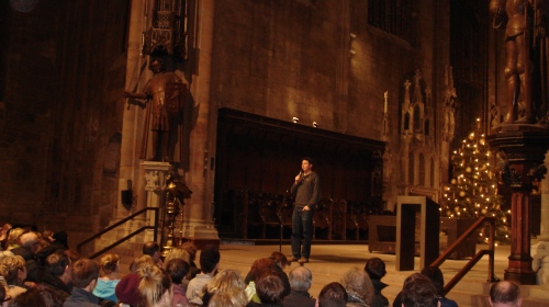 Ungewohnt ist die Halle auch für Moderator Sebastian 23: „Normalerweise ist die Decke nicht so hoch bei Poetry Slams.“ Noch überraschender schien es, eine Kirche so voll zu sehen. Entsprechend ergänzt er die obligatorische Slam-ModeratorInnen- Frage an das Publikum, wer denn zum ersten Mal beim Slam sei: „Wer ist zum aller ersten Mal in der Kirche?“ Ein Großteil der rund 450 Gäste hebt die Hand.