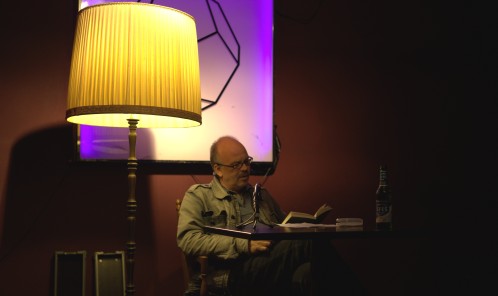 Das mit etwa 30 Menschen angemessen gefüllte Djäzz war zu Beginn der Lesung ausreichend mit Kaltgetränken versorgt. Es konnte also losgehen. Ohne jegliche Begrüßungsfloskel und mit fast schon störrischer Langsamkeit bewegte sich Tom Tonk samt Pils-Bier gegen 21:00 Uhr auf die Bühne. Wenn es sich hier nicht um eine Lesung in familiärer Atmosphäre gehandelt, der Autor nicht Tom Tonk gehießen und Duisburg nicht den Spitznamen „Dösburg“ gehabt hätte, wäre man vielleicht auf die Idee gekommen, dass der Hauptprotagonist des Abends gelinde gesagt nur wenig Lust auf die kommenden 90 Minuten inne hatte. Aber so war alles in bester Ordnung.