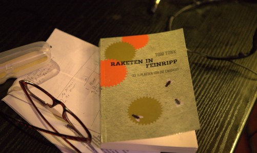 Das Djäzz konnte man an jenem Abend aus zweierlei Gründen als eine Art Wohnzimmer bezeichnen: Mit Teppichen, kleinen Sitzsofas, alten Omi-Möbeln und spärlicher Beleuchtung machte der kleine Kellerclub optisch auf gemütlich. Tom Tonk ist als geborener und gebliebener Duisburger nicht das erste Mal zu Gast, so dass sich der Mittvierziger durchaus Zuhause gefühlt haben dürfte. Während Tonk sonst auch gerne mal als Sänger der sich als Ruhrpott-Asi-Persiflage verstehenden Deutschpunk-Band Eisenpimmel fungiert, griff er an diesem Abend zum Buch und nicht zum Mikrofon. Tonks neustes Werk hört auf den Namen „Raketen in Feinripp. 33 1/3 Platten für die Ewigkeit“ und steht zumindest im Hinblick auf den Titel seinem Vorgänger „Raketen in Dosen: 33 1/3 Platten für die Ewigkeit“ in nichts nach.