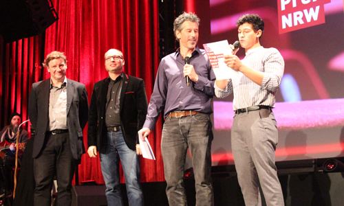 Um den Abend kurzweilig und unterhaltsam zu gestalten, wurden zwischen den einzelnen Ehrungsblöcken, in denen die Kinos gestaffelt nach der Höhe ihrer Prämien ausgezeichnet wurden, Trailer und Ausschnitte aus aktuellen und kommenden Filmen gezeigt. Regisseure und Schauspieler der immer auch zumindest teilweise in NRW gedrehten Filme standen für kurze Fragen auf der Bühne Rede und Antwort und fungierten im Anschluss als Preispaten bei der Überreichung der Urkunden. So beispielsweise Julius Weckauf und Joachim Król, die im neuen Film von Oscar-Preisträgerin Caroline Link, „Der Junge muss an die frische Luft“, die Hauptrollen spielen. Der zehnjährige Weckauf wurde darin als junger Darsteller Hape Kerkelings gecastet, auf dessen erfolgreicher Autobiografie der Film basiert. Auf der Bühne erzählte er von langwierigen Castingprozeduren, die ihn aber nicht entmutigen konnten. „Letztendlich wurde ich’s dann, und das hat mich gefreut“, enthüllte der junge Nachwuchsstar mit entwaffnendem Charme. Sein Filmvater Joachim Król merkte an: „Man kann von Julius lernen, an der Stange zu bleiben und sein Pensum zu erfüllen. Seine Kondition vermisse ich manchmal bei älteren Kollegen.“ Zu den weiteren prominenten Preispaten gehörten auch Timur Bartels und Regisseur Felix Binder, die gemeinsam den Film „Club der roten Bänder – Wie alles begann“ in die Kinos bringen werden, oder Jan Bonny, der zwei seiner Darsteller aus seinem kommenden Film „Wintermärchen“, Jean-Luc Bubert und Ricarda Seifried, mit nach Köln gebracht hatte. Als Paten für die Überreichung der Spitzenpreise mit Prämien bis zu 18.000 Euro fungierten Emilio Sakraya und Regisseur Wolfgang Groos, die gemeinsam „Kalte Füße“ gedreht haben. Ausgezeichnet wurden in dieser Kategorie einmal mehr die Filmpalette in Köln, das Kino in der Brotfabrik in Bonn sowie das Cinema in Münster.