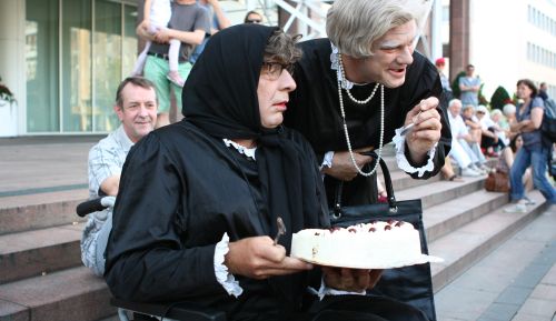 Das österreichische Theater Irrwisch ist so ein Act. Vier Grannies (Großmütterchen) machen den Friedensplatz unsicher. Kopfüber geht es an den Bierstand und auch das meterhohe Geländer vor dem Dortmunder Rathaus wird zum Klettergerüst. Nichts ist mehr vor den vier Männern in schwarzem Gewand und grauer Perücke sicher. Dem Publikum gemischten Alters gefällt´s. Es folgt dem Komiker-Quartett quer über den Platz, lacht und johlt.