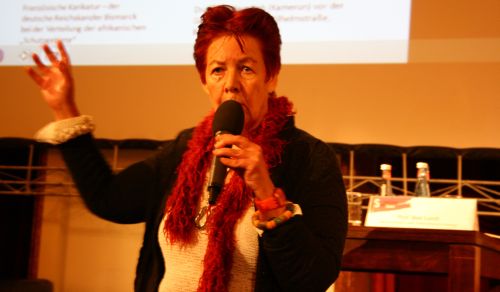 Auch die Historikerin Prof. Bea Lundt hat sich viel mit dem deutschen Kolonialismus beschäftigt und war Gastprofessorin an mehreren Universitäten in westlichen Staaten Afrikas. „Ich war 1972 das erste Mal dort und es hat mich nie losgelassen“, berichtete sie. Seit 2009 begleitet sie Austauschprogramme von Studierenden nach Ghana. Zu Beginn der Diskussion gab Lundt einen kleinen historischen Einblick in die Geschichte des deutschen Kolonialismus und zeigte die Entwicklung von Handelsniederlassungen zu fest verwalteten, besetzten Gebieten.