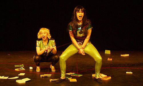 Nachdem der Luftkissen-Auftritt beendet und die Performerin (Fatima Talalini) abgegangen ist, tritt sie gleich darauf mit ihrer Kollegin (Lioba Sombetzki) wieder auf. Zu Tangoklängen, im Standardtanzschritt und in glitzernden Superheldinnen-Kostümen. Die Bühne ist leer, erst nach und nach füllt sie sich mit Gegenständen, die die Perfomerinnen im Laufe des Abends anschleppen, die sie benötigen um die vielen Themen des Abends zu verhandeln:
