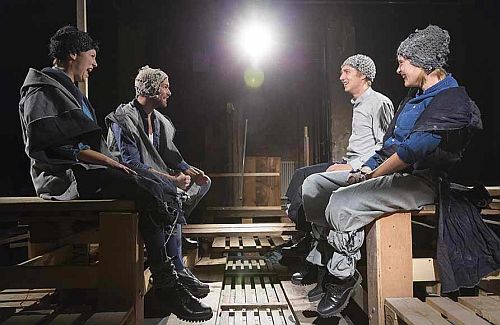 Das rustikale Bühnenbild aus Europaletten und groben Holzlatten steht in der Mitte des Bühnenraumes im Maschinenhaus. Das Publikum sitzt auf vier Tribünen an den Ecken. Die DarstellerInnen, ebenfalls zu viert, schleichen sich zu Beginn aus der Dunkelheit flüsternd auf die Bühne. Sie tragen identische Kostüme aus viel Wolle und zerrissenem Denim. Das Kostümbild erzählt in wenigen Augenblicken das, was das Bühnenbild schon andeutet – noch bevor der erste Satz gesprochen wurde: In dieser Geschichte wird es ungemütlich und arbeitsreich. Hier gibt es weder Rückzugsorte noch Platz für Individualität. Das Publikum ab 12 Jahren muss genau aufpassen, denn: Wer ist wer? Alle DarstellerInnen spielen mehrere Figuren, geschickte Details in den Kostümen lassen zu diesem Zweck minimale Veränderungen zu (eine Wollmütze wird z. B. zur Augenklappe).