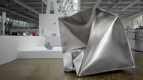 Wie reich und vielschichtig dieses Konzept ist, das zeigen jetzt die beiden Vierergruppen in den Flottmann-Hallen. „Cube Flower“ und „Cactus Flower“ stammen aus der jüngsten Zeit, ja, den vierten Teil von „Cube Flower“ hat Hilgemann erst bei der Eröffnung in den Flottmann-Hallen entstehen lassen, so dass das Publikum beobachten konnte, wie der Körper allmählich seine Form fand. Jede der zwei Gruppen beruht auf einem gedachten, dann auseinandergeschobenen Kubus, im Falle des „Cube Flower“ einem Würfel. Die jeweils vier gleichen Körper verhalten sich unter der Luftentnahme ähnlich, aber nicht gleich. Bei „Cactus Flower“ entstehen vier Pyramiden, die sich wie die Blätter eines Nachtschattengewächses zu öffnen scheinen, und die Teile der „Cube Flower“ knicken nach außen hin ein und nehmen umso mehr den Kontakt zum Außenraum auf. Vielleicht lässt sich die Formung der Teile sogar mit menschlichen Eigenschaften beschreiben? Wichtiger aber ist doch, die Oberflächen im Detail anzuschauen, wie dies Hilgemann schon 1995 im Katalog seiner Ausstellung im Museum für Konkrete Kunst Ingolstadt mit Detailaufnahmen vorgeschlagen hat. Die Umgebung spiegelt sich matt im Stahl, der perfekt wirkt. Die Stauchungen wirken samten, weich, gar nicht so verletzt, und aus der Nähe wird jedes Gefühl für die Dimensionen relativ: Ist der Grat denn nicht riesig und zumal im reflektierenden Licht wie aus weiter Ferne gesehen? All das lässt an Landschaftserfahrungen denken, wird zum Gleichnis für unberührte Natur. Ewerdt Hilgemann berichtet von seinen Aufenthalten im Death Valley, von den Sandverwehungen in der Wüste, und dann noch so ein beiläufiger Satz: „Der Fluss ist ein Bildhauerkollege“. Für ZERO sei er zu jung gewesen, für die berühmte Künstlerbewegung, die sich um 1960 im Rheinland formierte und mit den Materialien der Technik für die Wirkung von Licht und Bewegung interessierte und sich schließlich der Weite unbewohnter Gegenden widmete. Aber auch bei den „Imploded Cubs“ von Ewerdt Hilgemann läuft alles auf grenzenlose Schönheit hinaus, und dass seine Arbeiten tatsächlich einige hundert Kilogramm schwer sind, man möchte es nicht glauben, sondern: einfach nur staunen.