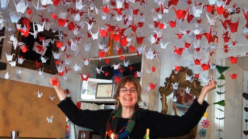Wenn Verena Hinze damit Recht hat, dann ist ihr kleines Atelier in diesem Moment nicht nur der engste, sondern auch der zauberhafteste Ort in Essen-Rüttenscheid. „Der Legende nach hat man einen Wunsch frei, wenn man tausend Papierflieger gebaut hat“, erzählt sie stolz den BesucherInnen, die sich in ihren Laden drängen. Über ihren Köpfen: Liebevoll zusammengefaltete Papierflieger, die von der Decke herunterhängen. Auf den Schränken stehen Figuren aus Pappmaché. Eine kleine Welt aus Papier.