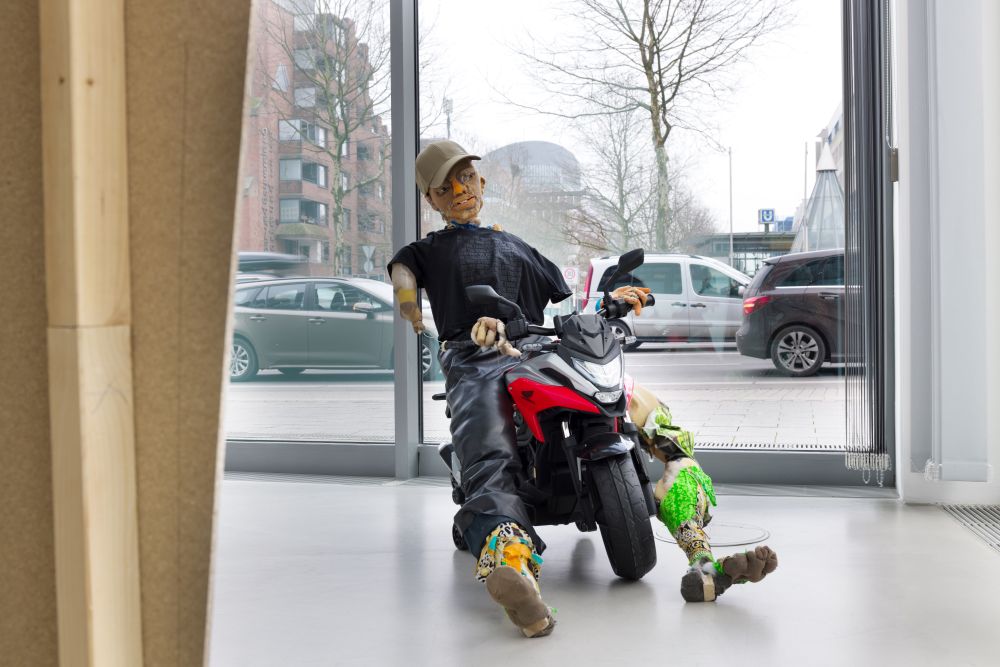 Die hohen Schaufensterfronten geben von außen den Blick frei auf bunte Figuren, auf Rollern, turnend, abhängend, herumstehend. Mit ihren vernähten Gesichtern und Gliedmaßen aus Fundstücken, Holz, Plastik und Metall wirken Wierschs Kreaturen zunächst wie grob zusammengeflickte Zombies aus Frankensteins Gruselkabinett. Bedrohliche Klänge aus dem Off verstärken im Raum das anfängliche Unbehagen. In der Annäherung passiert Unerwartetes: Der Grusel schwindet, die Figuren entpuppen sich als ausdruckstarke Persönlichkeiten. Mal sind es Doppelgängerinnen der Künstlerin, z.B. als Supergirl auf dem Kindermotorrad. Es gibt eine Spielhöhle auf dem Balkon, Mobiles aus Kleinkram, ein Jugendzimmer mit Fernsehwand zur Zeit der Videoclips auf Viva, dunkle Stiefel, weißbestrumpfte Beine mit Turnschuhen. In allen kargen Ecken ist was. Hier ein Schwarzer Mann, dort der deutsche Großvater, auf dem Galeriebalkon ein Marokkaner mit melancholischem Blick in die Ferne. Die dräuenden Klänge entstammen Wierschs Stop-Motion-Animation „Original Features“, die jene Vaterfigur in die marokkanische Landschaft stellt und mit dem 2017 zwangsgeräumten, heute noch leerstehenden Dortmunder Hochhauskomplex verbindet. Auch Hannibals Elefanten sind als Stofftier präsent – ein vieldeutiges Panoptikum, das anrührt und persönliche Zeitreisen anstößt.