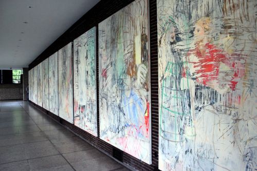 Gemeinsam kann man diese Kunstwerke nicht sehen – Markus Lüpertz stellt seine kleinen Bronzen zur monumentalen Gelsenkirchener Herkules-Figur im vorderen Ausstellungsbereich aus, sein Schüler Junior Toscanelli in der davon abgewandten Passage zur Straße hin – aber es macht Sinn, auf beide Ausstellungen gemeinsam einzugehen. Toscanelli hat bei Lüpertz an der Kunstakademie Düsseldorf studiert; neben Udo Dziersk, der mittlerweile selbst an der dortigen Akademie lehrt, ist er der vielleicht interessanteste und bekannteste seiner Schüler. Allerdings hat man hierzulande lange nichts von ihm gesehen. Anlässlich der Ausstellung in Duisburg erfährt man: Toscanelli hat mehrere Jahre in Paris gearbeitet. Dort hat er auch den „Zauberberg“ von Thomas Mann gelesen. Figurenkonstellationen aus diesem Roman bilden nun die Grundlage des 10-teiligen, spiegelbildlich angelegten Zyklus „Tous les deux“. Die hochformatigen Malereien auf Leinwand sind überlebensgroß, in Duisburg ist der Betrachter unmittelbar mit ihnen und ihrer komplexen Präsenz zwischen Figürlichkeit und Abstraktion konfrontiert. Fast naturalistisch, dann wie eine Silhouette tauchen Paare auf und werden von Farbe überlagert und mit gestischen Strichen geradezu zerstört und damit der Erinnerung in fast beängstigender Verdichtung überantwortet. Dies erreicht Junior Toscanelli durch die komplexen malerischen Vorgänge in der Rücknahme und im Eingriff in die Oberfläche. Er schließt hier an seine früheren Bilder und deren experimentelle Entstehung an, etwa indem er Filzflächen collagiert hat.