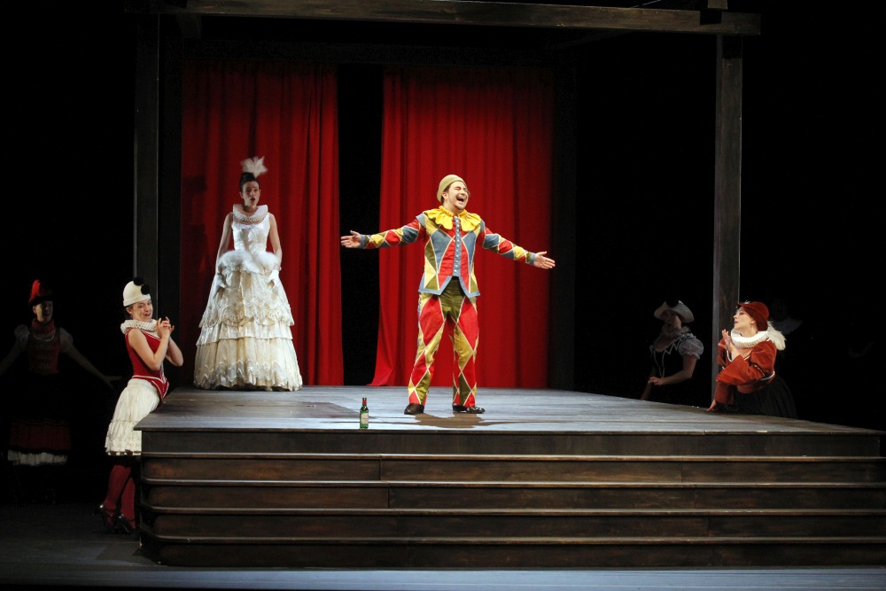 Hüsers hat die Handlung, die in einem baskischen Dorf des 18. Jahrhunderts verortet ist, als Spiel im Spiel modernisiert. Weil sein Ensemble durchweg noch sehr jung ist, lässt er es als Nachwuchskünstler einer Musikhochschule auftreten – was durch den Wechsel zu typischen Kostümen der Commedia dell´arte augenfällig wird (Kostüme: Katharina Weissenborn). Der zweite Akt ist dann quasi die Premiere in der Premiere. Die Idee ist nicht ganz neu, passt hier aber durchaus gut.