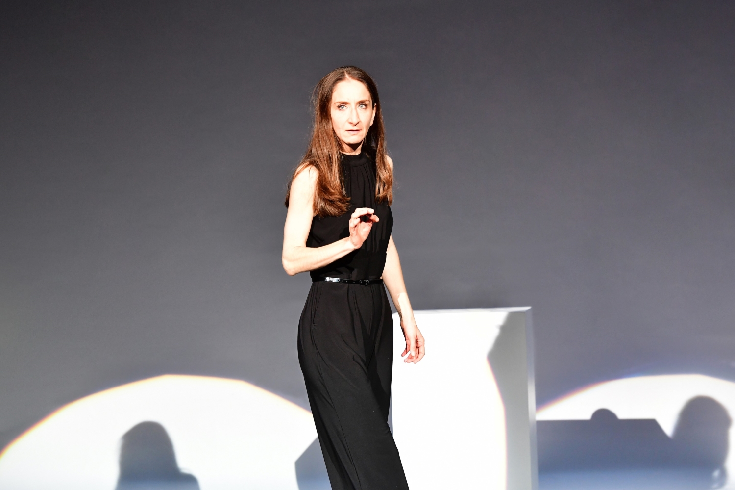Wer im Fotostudio steht, sollte sich nicht fragen, wer er ist, sondern wie er erscheinen möchte. In Stéphane Laimés Bühnenbild im Kleinen Haus in Düsseldorf zieht sich eine weiße Fotofolie über Hintergrund und Boden eines kleinen Spielpodests. Erhellt von ein paar typischen Studioleuchten. Hier präsentiert die 55-jährige Linda eine Antiaging-Creme für die Frau im Best Ager-Alter. Sie schwärmt vom „Confidence Building“, gibt auch in der Familie die Managerin und passt noch ins selbe Kleid wie vor 15 Jahren – Klassenziel erreicht, meint Linda, die gegen das Verschwinden der Frauen ab 35 aus dem öffentlichen Diskurs kämpft.