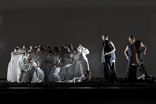 Finsternis total. Dann diffuses, graues Licht, eine Wand. Allmählich schälen sich Gestalten aus dem nebulösen Dämmer, mit dem Franck Evin die Kastenbühne Frank Philipp Schlößmanns überzieht. Etwas kriecht über die verbrannte Materie des Bodens, die später immer wieder zu schwarzen Hügeln aufgehäuft wird. So einen Tag haben sie noch nie gesehen, versichern sich Banco und Macbeth, und gleich werden sich in Giuseppe Verdis Oper über den blutigen Feldherrn Shakespeares die Hexen auf die beiden Krieger zuwälzen, ihre Beine umklammern. Kein Entkommen.