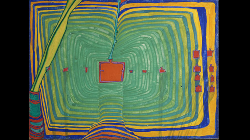 Ein Jahr später ist das Gemälde „Der Traum des toten Indianers“ entstanden. Die Spirale organisiert sich zur Kontur, das Geschehen wird dabei konkretisiert. Ein Indianer liegt im Grünen vor der nächtlichen Kulisse einer Stadt. Die Ursprünglichkeit im Einklang mit der Natur trifft auf das Fortschrittsdenken, das von Profit bestimmt ist und schließlich dominiert. Das Bild „Der Traum des toten Indianers“ wurde bald nach seiner Entstehung vom Osthaus Museum erworben, Hundertwasser befand sich in diesen Jahren mit seiner Teilnahme an der documenta und der Biennale Venedig und der Auszeichnung auf der Biennale Sao Paulo auf dem Zenit der internationalen Wertschätzung. Eine Ausstellungstournee führte seine Werke durch halb Europa und machte, vor 50 Jahren, Station in Hagen. Auch daran erinnert jetzt die Retrospektive im Osthaus Museum.