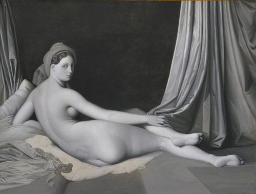 Eine Referenz ist die s/w-Fotografie, die – etwa bei den Gemälden von Gerhard Richter und Chuck Close – zitiert und sozusagen einverleibt wird. Ebenso spannend sind der frühe Altar von Marten de Vos, dessen graue Flügel mit der Darstellung der Verkündigung Marias in der Fastenzeit die bunten Schilderungen der Kreuzigung und der Auferstehung verdecken, oder die Lichtstudien von Rembrandt und die Grisaillen von Hendrik Goltzius und Ingres. Für die Moderne wären besonders Picasso und Giacometti zu erwähnen, wobei Picasso wiederum die ausgestellte „Odalisque“ von Ingres paraphrasiert.