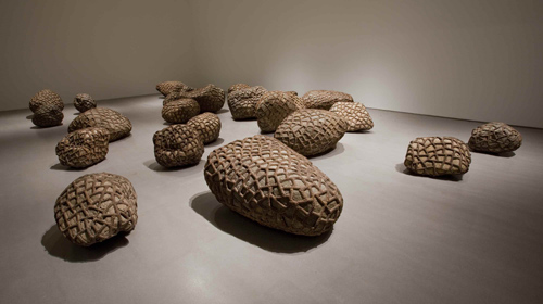 Auch im Lehmbruck Museum treffen wie auf diese Erfahrung der Schichtung und immer feineren Nuancierung im abstrakten Bereich. So hat Fang Lijun mit winzigen Kuben aus Porzellan in milchigem Weiß und delikater Farbigkeit atemberaubend schöne Skulpturen gebaut. Sie scheinen zusammenzubrechen und halten sich doch in der Balance, in gewisser Analogie zu Tempelanlagen, die im übertragenen Sinn den Wandel der Gesellschaft aushalten müssen. Direkt daneben stehen – ein kalkuliert krasser Gegensatz – Xang Jings lebensgroße realistische Fiberglas-Figuren. Unterstrichen durch die naturalistische Farbsetzung sind zeitgenössische Menschen zu sehen. Es sind die Haltungen, die irritieren, die Selbstbezogenheit auf den Körper oder einzelne Handlungen, welche die Figuren zu uns auf Distanz rücken. So „körperlich“ und direkt sie sind, so abwesend sind diese Figuren doch. Ähnliches kennzeichnet Sui Jianguos Feld aus Steinen, die in einem Korsett von Stahlbändern gefangen sind. Aus der Ferne wirken sie wie Korallen, tatsächlich treffen hier eine archaische Naturgewalt und der Fortschritt aufeinander. Das eine bändigt das andere, das sich trotzdem behauptet. Eingeschrieben ist diese Ambivalenz schließlich auch den mächtigen Selbstporträts in den Eisenfiguren von Yue Minjun, die sich sogar vor beiden Museen finden: Ihre Grimasse ist Glückseligkeit, befreiendes Lachen und größte Verzweiflung.
