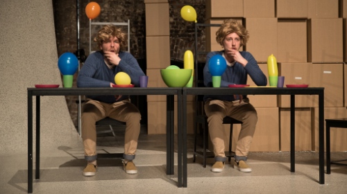 Als das Publikum den Bühnenraum des Maschinenhauses TOBOSO in Essen betritt, sitzen bereits zwei junge Männer an einem Tisch gegenüber. Die beiden Performer tragen die gleiche Kleidung, lächeln sich an, reagieren aufeinander, als wären sie sich gegenseitig ein Spiegelbild. Zwei Stühle an ihrem Tisch sind noch frei. An zwei Mikrofonständern hängen jeweils eine Perücke und ein Partyhütchen. Eine Wand aus Pappkartons grenzt den Bühnenraum nach hinten ab.