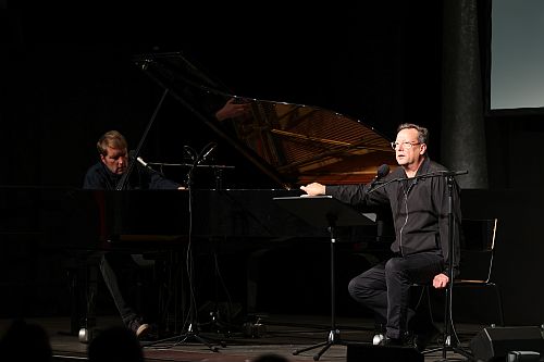 So führt uns Brandts Stimme zunächst auf’s Meer, wo wir Elis Fröbom kennenlernen, der dem Rat eines geheimnisvollen alten Bergmanns folgt und den Beruf des Seefahrers gegen den des Bergarbeiters eintauscht. Die tragische Erzählung der Romantik mit ihren schimmernden Verheißungen in der Dunkelheit und der dräuenden Gefahren wäre schon als pure Lesung von Matthias Brandt ein Hörerlebnis, doch Jens Thomas hebt dieses Erlebnis mit seiner musikalischen Begleitung in höhere Sphären. Er beschränkt sein Klavierspiel nicht auf die weißen und schwarzen Tasten, sondern nutzt den aufgeklappten Flügel als Resonanzraum für seine Stimme und als Perkussionsinstrument, zupft und schlägt an den Klaviersaiten. Lesung und Musik gehen eine mitreißende Verbindung ein – und wenn Jens Thomas aus der untermalend-begleitenden Rolle heraustritt und sich erkennbare Songstrukturen herauskristallisieren und in eigenwillige Interpretationen von z.B. Neil Youngs „Heart of Gold“ münden, dann ist dies kein Bruch, sondern alles an dieser Kooperation wirkt wie aus einem Guss. Auch wer seinen E.T.A. Hoffmann kennt, fiebert bis zum tragischen Ende mit und die Standing Ovations zum Schluss sind mehr als verdient.