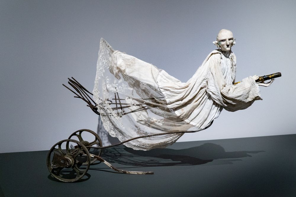 Die werden, chronologisch stimmig, im letzten, zentralen Ausstellungsraum präsentiert. Dennoch empfiehlt es sich, den Parcours in diesem lebhaften „Gruselkabinett“ zu beginnen, bevor man sich den Werdegang beider im Galerieumgang erschließt. Tinguely startete in den 1950ern durch mit kinetischen Bildobjekten, Mobiles und seiner erste Malmaschine, während Aeppli fratzenhafte Gestalten in Kohle zeichnete und erst handliche, später melancholische Menschenpuppen mit bodenlangen leeren Samtgewändern nähte und Totentanzbilder malte. Der Tod ist immer nah. Ebenso die leise Beklemmung, wenn am Ende Tinguelys motorgetriebenen Apparaturen Aepplis zarte Stoffwesen herumschleudern. Der Mensch und die Maschinen – eine emotionale Allianz. Und fortlaufend aktuell.
